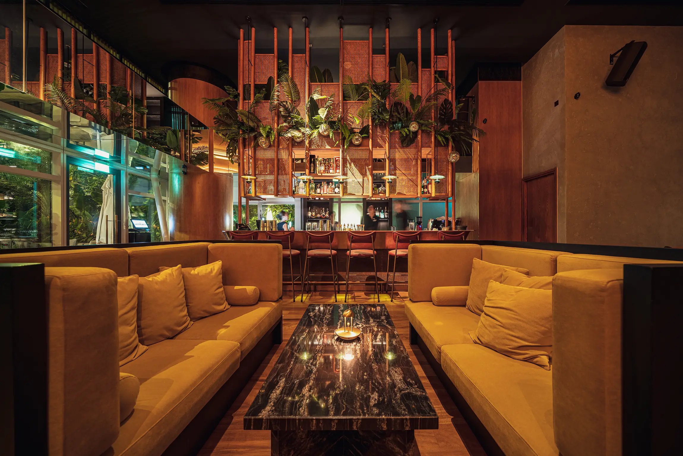 BarSon Lounge at Le Méridien Saigon is a vibe-dining bar on the ground floor of the hotel at 3C Ton Duc Thang, District 1. With a lush, tropical-jungle inspired interior—think rattan doors, a standing bar, sunken seating, and vibrant greenery—it feels like a hidden urban oasis.